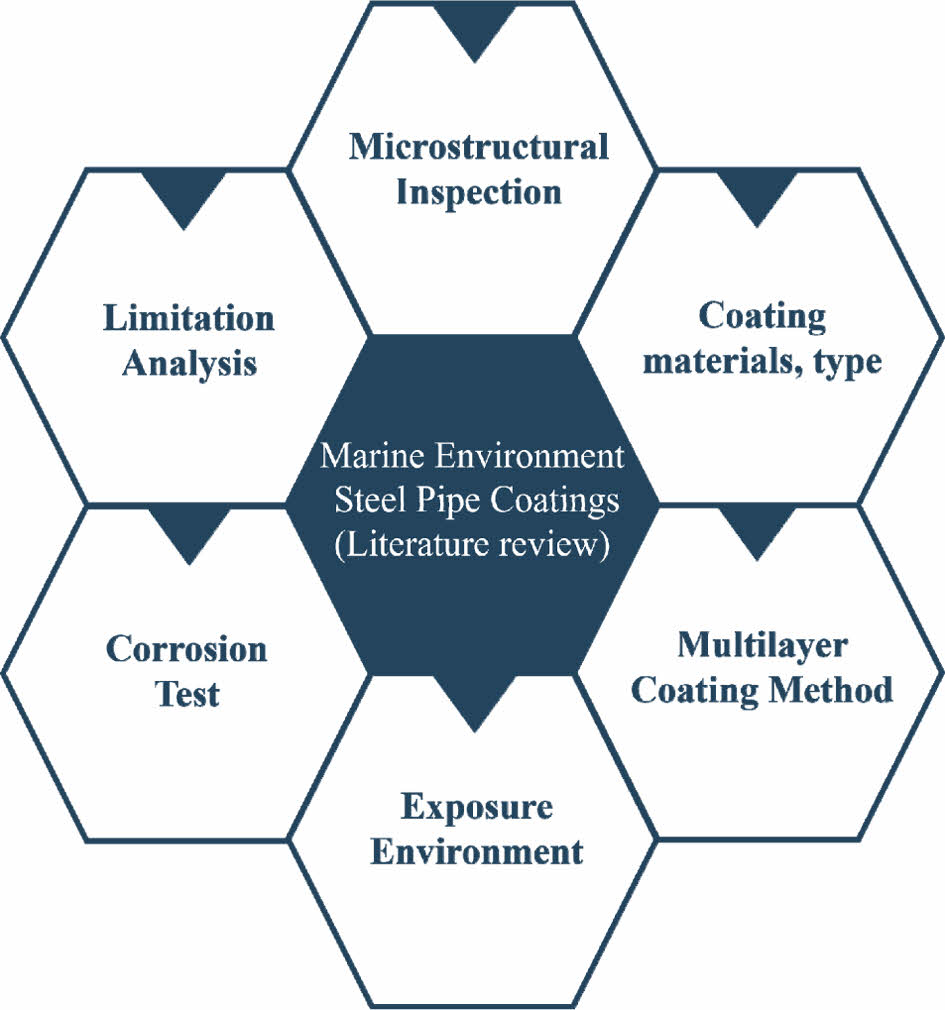 해양 구조물에 적용된 코팅의 성능에 영향을 미치는 주요 요인으로는 코팅의 종류, 노출 기간 그리고 노출 조건 등이 있으며 조사 방법으로는 실해역을 모사한 부식 시험, 표면 및 미세 구조 변화 파악 등이 있을 수 있다. 이에 본 연구에서는 해양 환경 노출 코팅 재료의 특성을 조사하기 위해 아래 Fig. 4와 같은 조사 항목들을 설정하고 기존 연구들에 대한 조사/분석을 실시하였다.