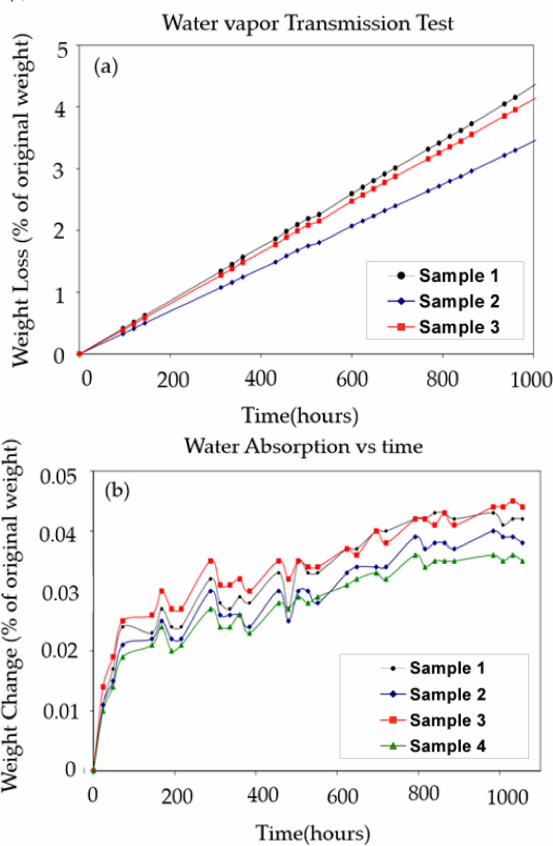 Fig. 5 Weight loss and weight change result of each coating through (a) water vapor transmission test, (b) water absorption test [21] |