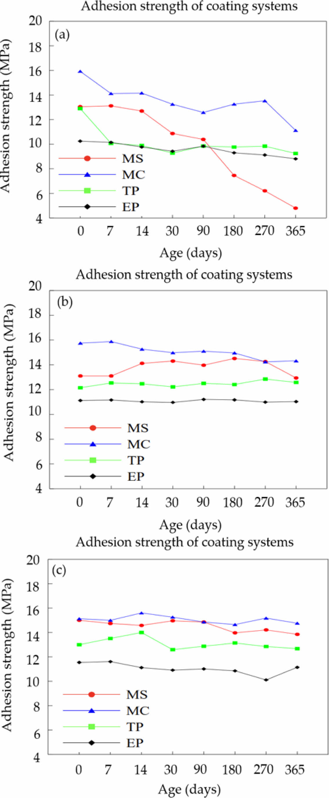 Fig. 6 Adhesion strength of coating systems exposed to (a) tidal zone, (b) atmosphere zone, (c) underwater [22] |