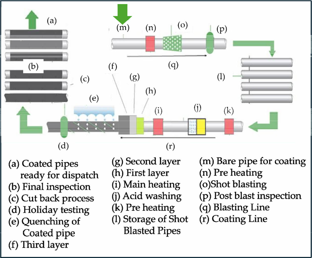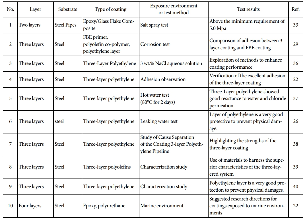 이와 더불어, 해양 환경과 같은 가혹한 반복 부식 조건에 노출된 강관은 치명적인 손상이 발생할 수 있으며 실제로 노르웨이의 대기연구소는 해양환경(marine splash zone)에 노출된 강관이 심각한 손상을 입었다고 보고한 바 있다[18, 19]. 최근, 이러한 해양 구조물의 효율적인 유지관리를 위한 표면 보호 연구 사례가 보고되고 있는데 코팅은 바닷물과 같은 외부 환경과 강관 사이에 장벽을 만들어 향상된 보호 기능을 제공하며 탄화수소, 습기 등에 기인한 부식을 방지하는데 효과적이었다[20]. 또한, 연구자들은 Fig. 3과 같이 강관의 부식방지를 위한 복층 코팅 공법을 최근 적용하고 있다. 관련 사례로 페르시아만에서 수행된 코팅 성능에 관한 연구도 보고된 바 있다[10].