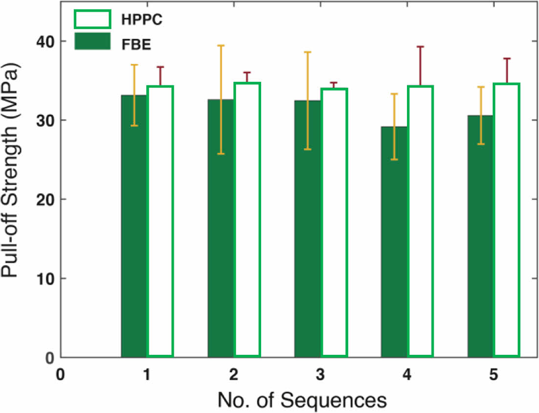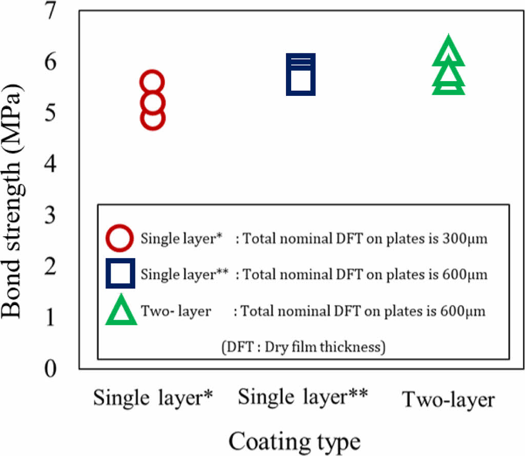 Table 3는 해양환경 노출, 염소 분무, NaCl 용액 노출, 수중환경 노출과 같은 열악한 환경을 모사한 실험을 통해 코팅층이 내구 성능에 미치는 영향을 보여주고 있다. 강관에 다층(multiple layer) 코팅하는 구체적인 공정은 Fig. 7과 같다. 단일 층으로 코팅하는 공법보다 레이어를 추가하여 Two-layer, Three-layer, 혹은 Four-layer로 코팅하는 공법을 강관에 적용할 경우, 해양 환경에서 코팅의 내구성이 크게 개선됨을 확인하였는데 이는 다층 코팅이 수분의 유입과 유해 환경 노출로 인해 발생하는 유해 물질의 투입을 방지하였기 때문으로 판단된다[41]. Two-layer epoxy/glass flake composite coating은 극한환경 모사 실험에서 향상된 내부식성을 보였으며 부착강도 또한 최소 요구사항인 5.0 MPa를 상회하는 결과를 얻었다[33]. FBE primer, polyolefin co-polymer, PE로 이루어진 Three-layer의 경우 부식시험에서 일반 FBE 코팅보다 높은 부착을 보였다[29]. 코팅 두께 3.0–3.5 mm의 PE로 구성된 Three-layer PE 코팅은 우수한 부착을 발휘하여 파이프 라인을 부식으로부터 보호하기에 적합하다고 보고되었다[22]. 또한, Three-layer PE 코팅은 우수한 물 침투 저항성과 염화물 이온 침투 저항성을 보였으며 구조물의 수명을 향상시켰다[37,38]. 이에 더하여 높은 기계적 강도를 보유한 epoxy와 유연성을 가진 polyolefin을 결합하여 우수한 접착력과 음극 박리 저항성(cathodic disbanding resistance)을 발휘하는 Three-layer polyolefins coating이 개발되었다[39]. 이러한 Thee-layer polyolefins의 사용과 관련된 우려가 여전히 존재하지만 지난 20년 동안 우수한 현장 적용성을 보였다[23]. 또한 Three-layer로 코팅하였을 경우보다 Four-layer의 방식으로 코팅하였을 시에 더욱 코팅재료의 성능이 향상되었다. 또한, Three-layer로 이루어진 epoxy 기반 코팅보다 Three-layer Epoxy 기반 코팅에 Zn+AL layer를 추가한 경우 보다 높은 부착 강도가 확인되었다[22]. Fig. 8은 다층 코팅 여부 혹은 코팅 두께가 부착강도에 미치는 영향을 나타낸다. 가속 중성 염수 분무 시험 이후 부착 강도를 측정한 결과, 300μ의 단일 코팅층은 이중층의 코팅과 600μ 두께의 코팅층보다 다소 낮은 부착강도를 보였다[33]. Table 4는 강관에 적용된 코팅층과 두께가 수중 환경 노출시의 기포 발생에 미치는 영향을 조사한 실험 결과이며 블리스터 발생시 실험을 종료하였다. 실험 결과, 가장 두꺼운 코팅 B의 경우 단일 층임에도 A, C 코팅 대비 기포 발생이 억제되었다. 또한, 이중으로 코팅된 E, F는 노출기간동안 기포가 관찰되지 않았다. 이러한 결과는 앞서 보고된 실험과 동일하게 다층 코팅과 코팅 두께의 효과를 나타내는 것으로 해양 환경 노출 강관의 경우 이러한 공법을 사용하면 보다 개선된 부착 효과를 보일 것으로 판단된다. 다만, 적용 이전에 실해역 실험을 통한 장기 관찰이 필수적으로 선행되어야 한다.
