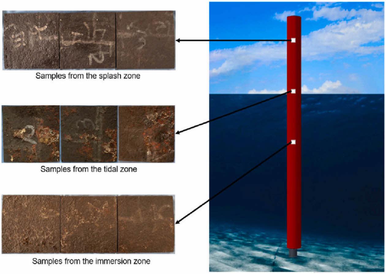 해양 환경에 노출된 강관 말뚝은 비말대, 조간대, 침수대에 노출될 수 있으며 Fig. 10과 같이 부식과 마모를 유발시킨다. 이에 해양 혹은 극한 환경에 노출된 코팅의 표면 변화 및 부식 정도를 파악하기 위한 SEM이미지 분석 사례를 조사하였다.