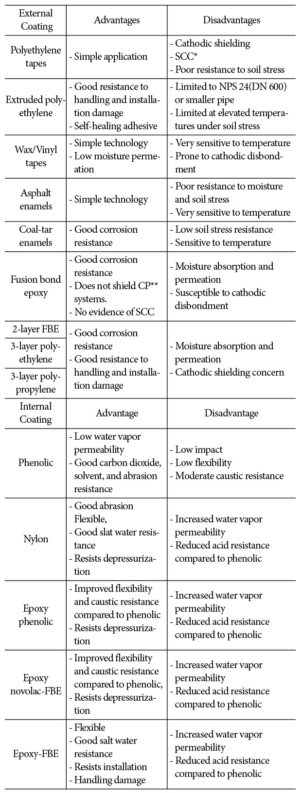 Table 1은 강관에 적용 가능한 폴리머 코팅의 종류, 특징 그리고 장단점 등을 나타내고 있다. 페놀수지(phenolic resins)은 고온 및 고압에서 뛰어난 성능을 보이고, 수증기 투과율이 낮으며, 이산화탄소 및 마모에 강한 저항을 보였으나 충격에 취약하고 유연성이 제한적이었다. 이에 반해, 우레탄 라이닝(urethane linings)은 마모 저항력과 유연성이 우수한 특성을 보였다. 나일론 코팅(nylon powder linings)은 유연성이 우수하고 마모, 염수, 충격 등에 저항을 제공하지만, 온도와 산에 대한 저항은 다소 떨어지는 경향을 보였다. 부식 혹은 극한 환경에 노출되었을 경우, 상기 코팅 이외에도 PE tapes, extruded PE mastic, waxes and vinyl tapes, asphalt enamels, coal-tar enamels 등이 적용 가능하다. 염소 분무 시험 결과, 그래핀 코팅(graphene)은 에폭시 코팅(epoxy zinc rich)에 비해 우수한 부식 저항력을 보였으며 폴리우레탄(polyurethane)은 부식 환경에서 뛰어난 내식성을 발휘하였다[24,25]. PE 라이닝은 우수한 표면 보호 성능을 제공함과 동시에 내구성 확보에 기여하였으며 수중 환경 노출 실험에서 PE glycol copolymer는 일반 강철 대비 부식 성장률을 크게 감소시켰다. FBE(Fusion Bonded Epoxy)는 우수한 화학 저항성을 제공하며 해양 환경 노출 강관에 적합하다고 판단된다[23]. FBE는 개선된 폴리머 구조를 보여 장기간의 수열 노화를 견딜 수 있으며 이로 인해 접착강도에 대한 민감성(sensitivity)을 감소시킨다고 보고된 바 있다[29]. FBE와 강관의 우수한 부착력 또한 화학 및 부식 저항성 향상에 긍정적인 영향을 끼칠 것으로 판단된다. 실제로 해양 환경에 노출된 FBE의 부착력이 에폭시 사슬과 유기작용기(organofunctional groups) 사이의 새로운 공유 결합으로 인하여 향상되었다고 보고된 바 있다[34].