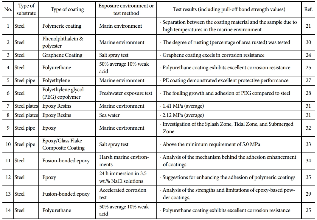Table 2는 해양 환경 노출 강관의 표면 보호를 위해 주로 사용되는 코팅 종류별 부착강도와 내구성 평가 시험 결과를 나타낸다. 조사된 코팅재료의 부착강도는 pull-off 시험을 통해 얻어진 물성치이다. 해양 환경 노출 에폭시 코팅 강관은 비말대(splash zone)와 조간대(tidal zone)에서 치명적인 손상이 발생하였다고 보고된 바 있다[20]. 또한, 에폭시 기반 분말 코팅은 자외선이 존재하는 습한 환경과 염에 노출될 경우 분해(degradation) 될 수 있는 가능성이 존재한다. 따라서 에폭시 코팅의 성능을 강화하기 위한 다양한 연구가 진행되어져 왔다. 에폭시 코팅의 성능을 강화하기 위해 유리분말(glass flake)의 사용이 고려되었으며 유리 분말의 혼입은 우수한 마모 저항성, 낮은 수증기 투과성, 화학적 안정성을 보여주었다[22]. 이에 더하여 벤조이미다졸(benzoimidazole)의 가능성도 검토되었는데 염화물 환경에 노출된 에폭시 코팅에 0.75 wt.%의 벤조이미다졸을 첨가함으로써 부착력이 크게 개선됨을 확인하였다[35]. 또한, 해양 환경에 노출된 epoxy 코팅제는 최대 75%의 부식 면적이 나타났지만 Thymol Blue와 Phenolphthalein가 추가 혼입된 epoxy 코팅제에서 각각 최대 30%와 60%의 감소된 부식 면적이 관찰되었다[30]. 이는 추가적인 코팅재료 및 강화제를 적절히 혼용할 경우 코팅재료의 내부식성과 계면결합강도를 향상시켜 염화물 환경과 같은 취약환경에 노출되었을 때 내구성 저하를 방지할 수 있음을 시사한다.
