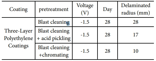 Table 5 Cathodic disbondment analysis of the 3LPE coatings applied on substrates with different pretreatments [36] |