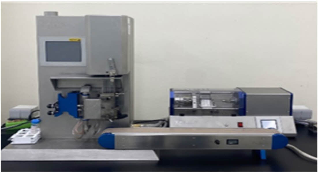 나노복합재료는 적절한 온도와 압력에서 만들어져야 한다. 온도와 사출력을 조정할 수 있는 마이크로 컴파운더 사출기를 사용하여 PCL 모재에 Fe3O4를 첨가시켜 시편을 제작하였다. 사용된 마이크로 컴파운더는 5 g 샘플의 연속 가닥 압출, 전용 주입 장치를 통한 사출 성형까지 처리할 수 있다. 또한, 최대 온도 450°C, 스크류 최대 속도 400 rpm, 사출력 18 kN이 가능하며 사용된 마이크로 컴파운더 사출기 (Xplore MC5 Instruments BV, 네덜란드)는 Fig. 1과 같다.