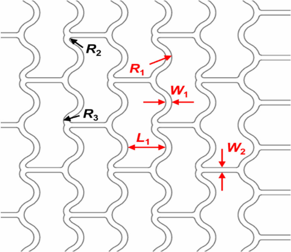 스텐트의 형상은 현장에서 사용되고 있는 strut-connector 구조가 사용되었다. 스텐트 패턴의 단방향 길이(L1), 스트럿 곡률(R1), 커넥터 안쪽 곡률(R2) 커넥터 바깥 곡률(R3) 웨이브 패턴 두께(W1), 커넥터 두께(W2) 등의 설계 변수를 설정하였다. 스텐트 패턴의 설계변수는 Fig. 3과 같이 나타낸다.