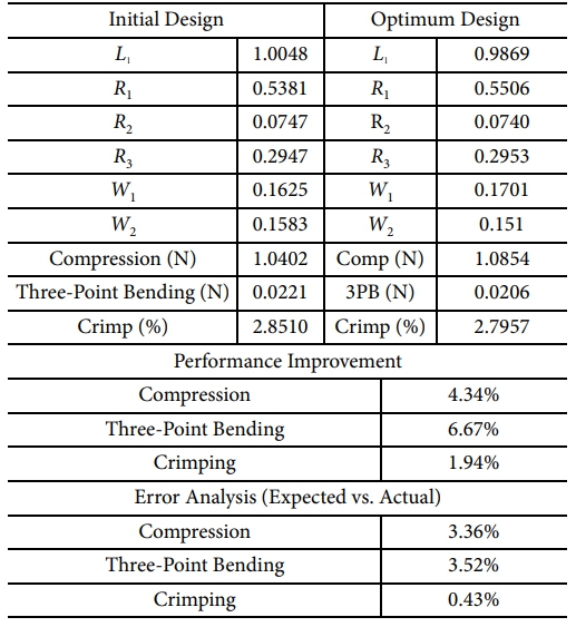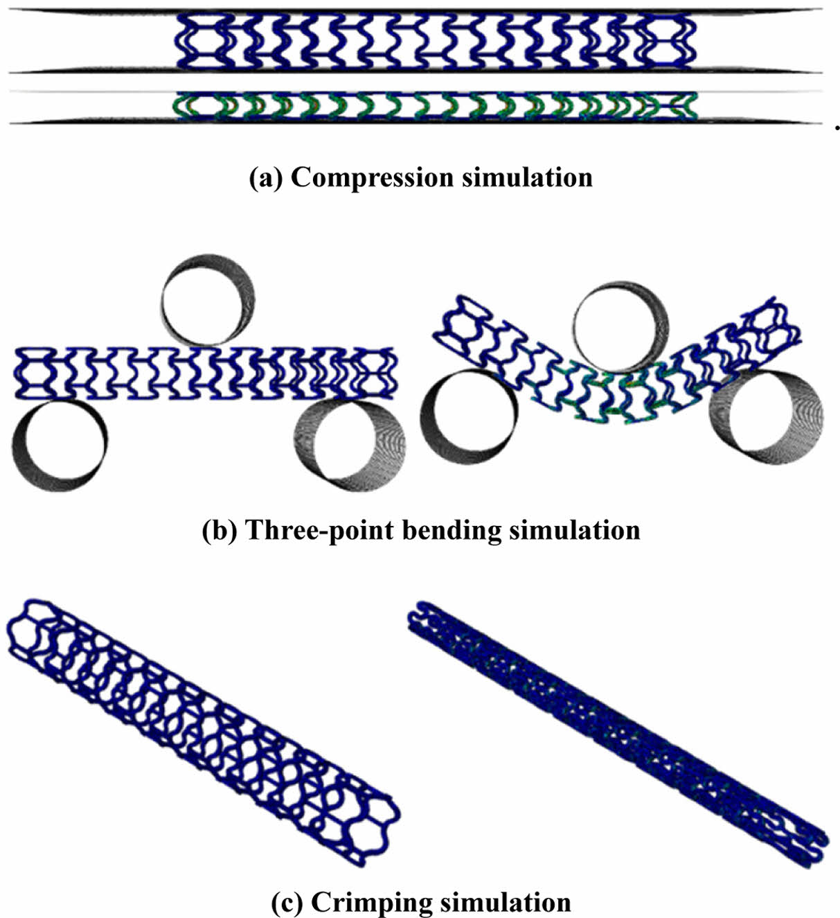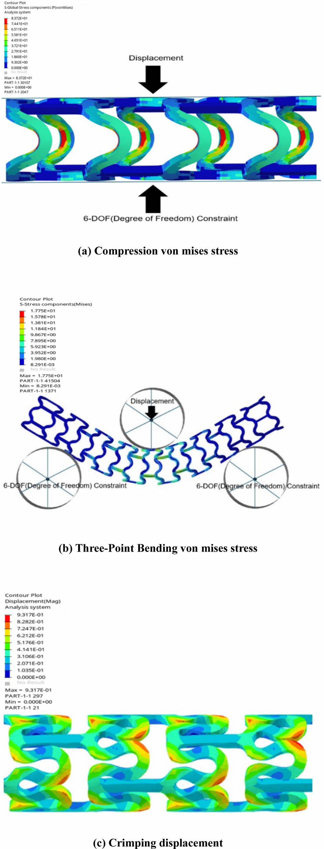 압축 반력(fcomp)은 스텐트 내구성을 평가하기 위한 목적 함수로 압축 해석을 통해 얻을 수 있다. 스텐트가 압축에 저항하고 최소 0.5 N의 반력을 달성하도록 최적화되었다. 유연성(fflex)은 스텐트 유연성을 평가하기 위한 목적 함수로 3점 굽힘 해석을 통해 얻을 수 있다. 상부 지그에 의해 스텐트에 가해지는 반력을 최소화하도록 최적화되어 최대 3 N을 넘지 않도록 해야 한다. 압착(ffore)은 스텐트가 카테터에 안정적으로 배치되도록 하기 위한 목적 함수로 압착 해석 통해 얻을 수 있다. 압착 전후의 스텐트 길이 변화를 최소화하고, 5%를 넘지 않도록 최적화하는 것이 필요하다.