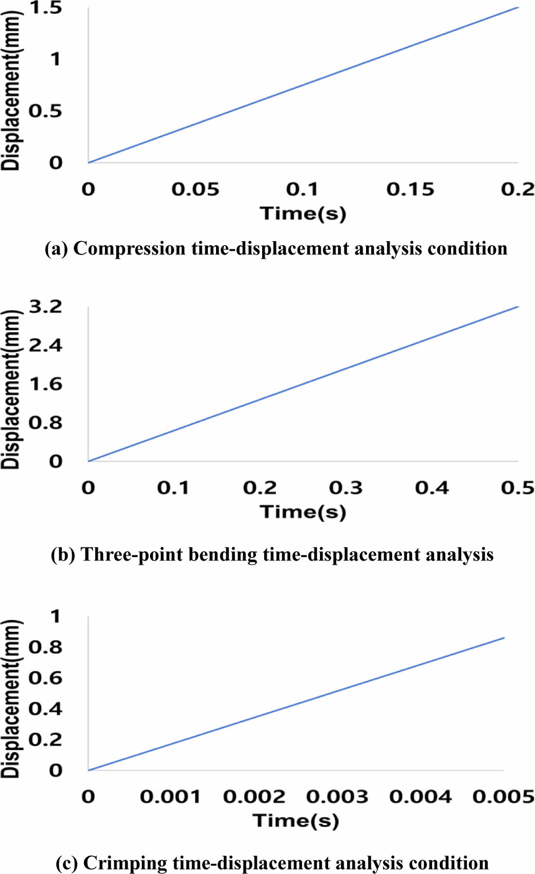 Fig. 6 Time-displacement for the quasi-static (a) Compression time-displacement analysis (b) Three-point bending time-displacement analysis (c) Crimping time-displacement |