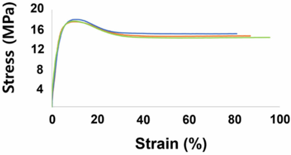 인장 시험은 PCL/Fe3O4 복합재료의 기계적 물성을 측정하기 위해 수행되었다. 15% Fe3O4를 함유한 복합재 인장 시험 결과는 17.58 MPa 인장 강도를 가졌으며, 533.35 MPa의 탄성계수를 가졌다. 해당 인장시험 결과는 Fig. 7과 같다.