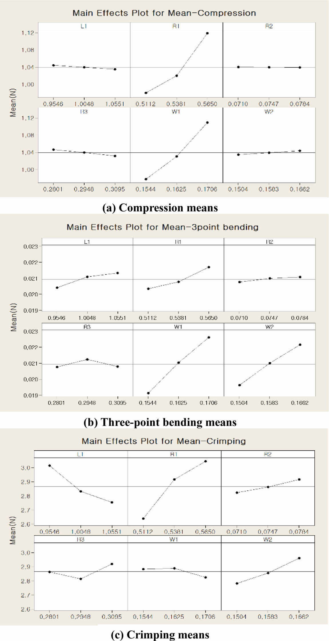 스텐트 설계변수에 수준 변화에 대한 목적함수 영향을 보기 위해 민감도 분석을 수행하고 유의성을 검증하기 위해 분산분석(Analysis of variance)를 수행하였다. Fig. 9는 압축, 3점 굽힘, 압착 해석에 대한 민감도 해석 결과를 나타내고 있다.