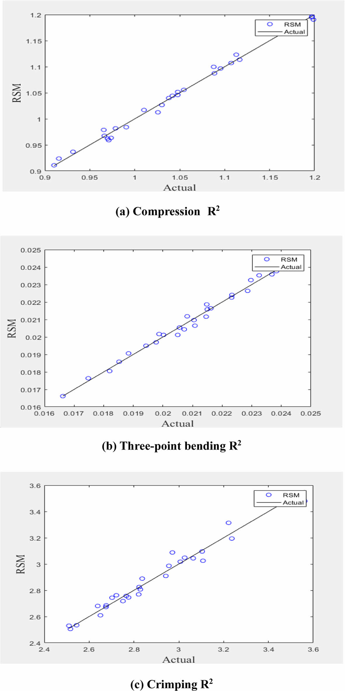 Fig. 10 Coefficient of determination results (a) Compression R2 (b) Three-point bending R2 (c) Crimping R2 |