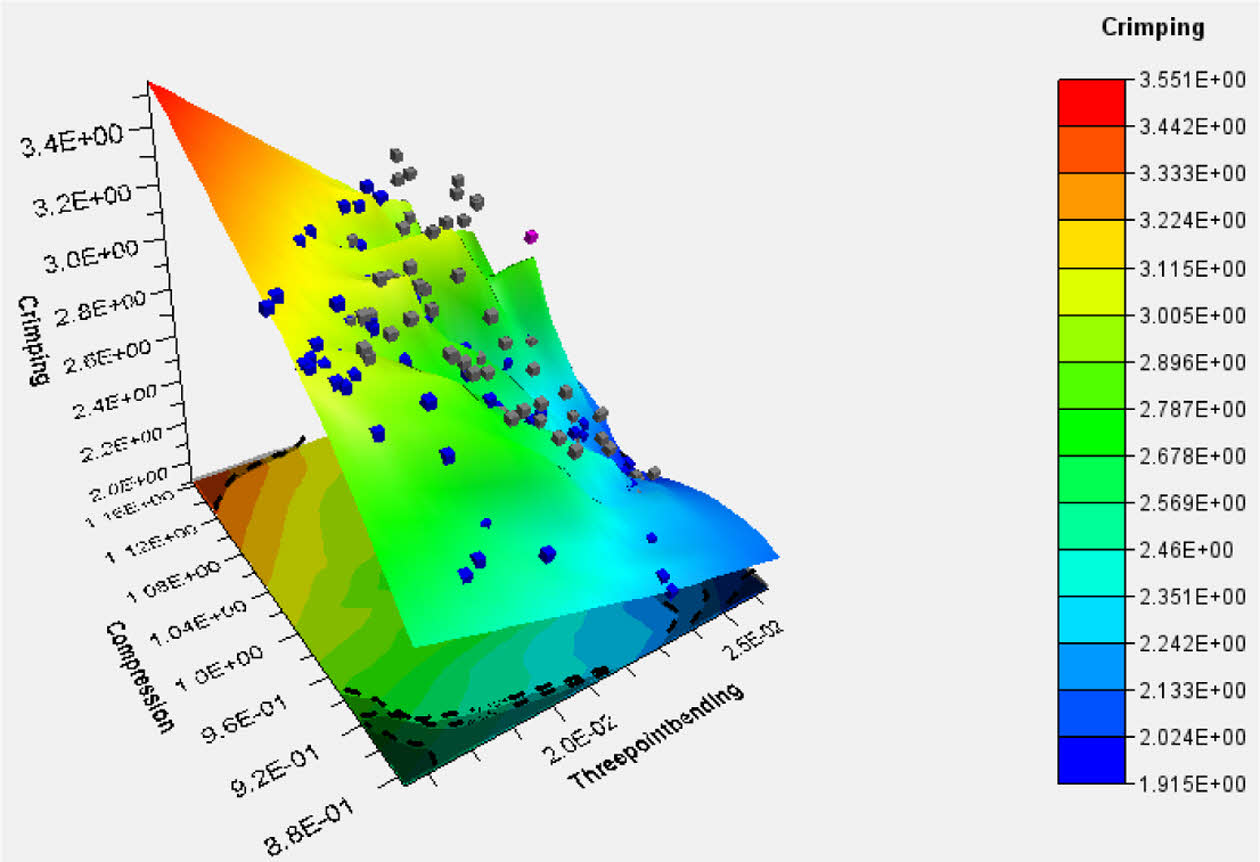 메타 모델의 정확성은 실제 결과와 예측 간의 오류 분석이 평가되어야 한다. 압축 반응 결과에 대한 결정 계수(R2) 값은 99.3%로 높게 나와 예측결과에 높은 상관관계가 있다는 것을 보여주며, 3점 굽힘 반응 결과에 대한 결정계수(R2) 값 또한 98.7%로 높은 상관관계가 있다는 것을 보여준다. 압착해 반응 결과에 대한 결정 계수는 96.44%로 95% 이상의 결정 계수 값을 가져 메타모델을 통한 예측 값이 신뢰성이 있음을 나타낸다. 각 예측 결과에 따른 R2 값은 Fig. 10에 나타나 있다.