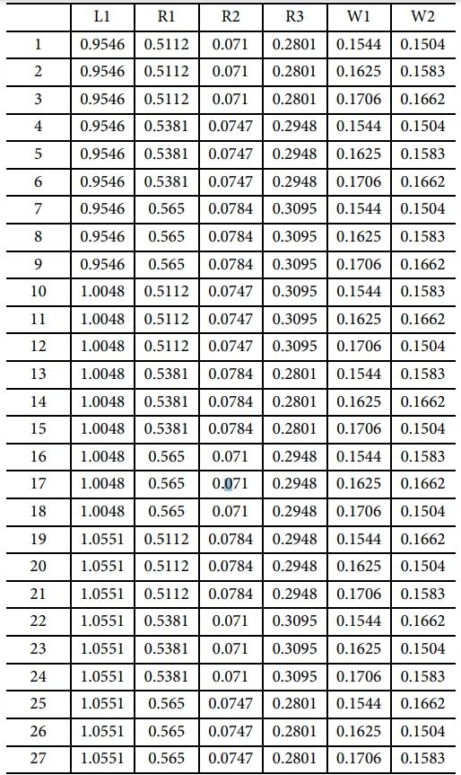 다구찌 직교배열표를 활용한 실험계획법은 목표함수의 변화를 파악하는 데 유용한 방법이다[12]. 다구찌 방법을 통해 필요한 최소 실험 횟수와 설계 변수 값들을 체계적으로 결정할 수 있다. 본 논문에서는 3수준 6요인으로 효율적인 설계를 위해 Table 1과 같이 L9(36) 직교표를 구성하였다.