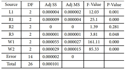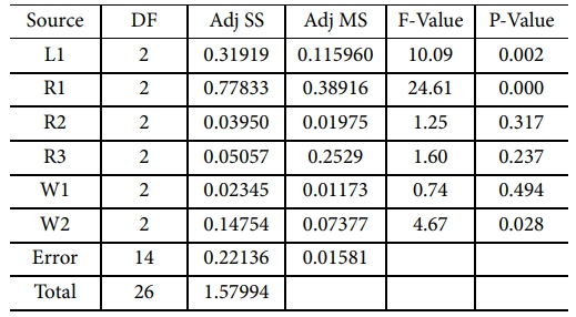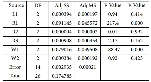 민감도 분석을 통해 6가지 변수의 주 효과 분석을 수행하였다. 압축 결과에서 R1과 W1의 변수가 영향을 미치는 것으로 도출되었다. 3점 굽힘의 경우 W1과 W2가 가장 영향을 미치는 것으로 도출되었다. 압착 결과에서는 L1과 R1이 영향을 미치는 것으로 도출되었다. 이는 R2와 R3는 스텐트의 해석 결과에 크게 영향을 미치지 않는 것으로 판단되며 4가지 변수를 조정하여 최적설계를 도출할 수 있음을 의미한다. 또한, 민감도 분석 후에 6가지 변수에 대한 분산분석을 진행하여 통계적 유의미함을 도출하고자 하였다. 분산분석을 통해 스텐트의 설계 변수들이 영향을 미치는지 확인할 수 있고, 그에 따른 변동성을 통계적으로 알아볼 수 있다. DF는 자유도를 나타내어 설계 변수의 변동 수준의 개수를 나타내며, Adj SS는 각 변수의 변동, Adj MS는 각 변수의 변동 평균, F 값은 변동성이 오차에 비해 얼마나 큰지를 나타내며, F 값이 발생할 확률인 P 값을 도출함으로써 스텐트의 설계변수의 통계적 유의미함을 나타낼 수 있다. Table 3, Table 4, Table 5는 분산분석 결과를 나타내고 있다.