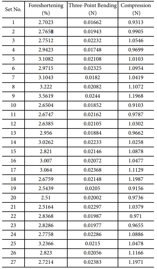 분산분석결과 압축해석에서는 R1, R3 변수 P 값이 각각 0.000, 0.0152로 0.05보다 작은 값이 도출되었다. 이는 분산이 비슷하여 같은 변동성을 가진다는 의미이고 95% 이상 유의수준을 가지는 것이 통계적으로 검증되었다. 3점 굽힘 시험에서는 L1, R1, W1, W2 변수의 P 값이 각각 0.001, 0.000, 0.000, 0.000으로 0.05보다 작은 값이 도출되었다. 이는 L1, R1, W1, W2 변수 모두 95% 이상 유의수준을 가지는 것이 통계적으로 검증되었음을 의미한다. 압착 해석에서는 L1과 R1 변수 P 값이 0.002, 0.000로 0.05보다 작아 95% 이상 유의 수준을 가지는 것으로 확인되어 통계적으로 유의미함이 검증이 되었다.