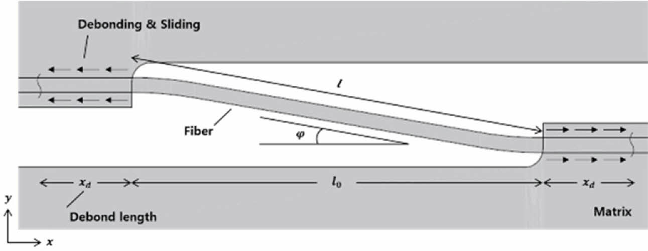 여기서 n0, Ef , df , l0, φ 및 t는 단위 면적 당 초기 가교된 섬유 수, 섬유의 탄성 계수, 섬유의 직경, 초기 섬유의 가교된 길이, 가교된 섬유의 각도 및 섬유-모재 간 계면 마찰 전단 저항력이다. 식 (1)에서 계면의 섬유 각도(q)를 고려하기 위하여 Fig. 2와 같이 섬유 배열 각도가 0o인 경우와 qo인 경우를 모식도로 표현하였다. AB는 섬유 배열 각도가 0o인 섬유이며, AC는 섬유 배열 각도가 qo인 섬유이다. 식 (1)에서 섬유 배열 각도에 따라 영향을 받는 변수는 초기 섬유의 가교된 길이, 가교된 섬유의 각도 및 단위 면적 당 초기 가교된 섬유 수이다. 본 논문에서는 섬유 배열 각도에 의한 초기 섬유의 가교된 길이 및 가교된 섬유의 각도는 영향을 받지 않는다고 가정하였으며, 각각 200 mm[2] 및 가교된 섬유의 최대 각도(φmax)를 참고문헌[2]에서 제시된 10-12o의 평균 값인 11o로 가정하였다.