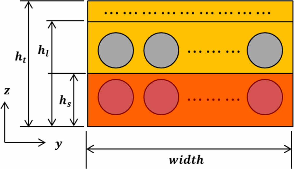 Fig. 3은 전체 두께 ht를 가진 복합재 적층판의 단면의 형상이다. 복합재 적층판의 섬유의 간격은 두께 방향(x 축)과 폭 방향(y 축)에 대하여 균일하다고 가정하였으며, hl은 복합재 적층판의 라미나(lamina)의 두께를 의미한다. 라미나는 보강 섬유가 한 줄로 배치되어 있는 여래 개의 층으로 구성되어 있고 라미나의 여러 개의 층 중에서 균열 면에 인접한 최외각층(Outer layer)에서 섬유 가교 현상이 일어난다고 가정하였다. 이때 최외곽층의 두께를 hs로 정의하였다. 균열 면에 인접한 최외각층에 포함된 섬유의 수는 복합재 적층판의 섬유 체적 비에 영향을 받으며 섬유 체적 비에 따른 섬유 간격은 식 (2)과 같다[2].