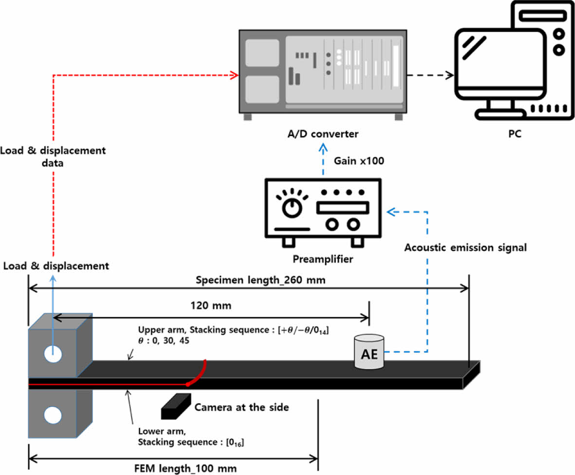 Fig. 5는 DCB 시험의 모식도이다. 시험은 ASTM 5528[22]에 준하여 수행되었다. 시험 장비로는 만능 시험기(INSTRON 5900R)가 사용되었으며, cross-head 변위 속도가 1 mm/min인 변위 제어 조건에서 시험이 수행되었다. 하중 및 변위 데이터는 10 Hz의 속도로 기록되었다. 균열 길이 기록을 위하여 측면에 광학 장비를 설치하였다. 하중 지점으로부터 120 mm 떨어진 지점에 적층판의 파단으로 발생하는 탄성파를 측정하기 위하여 Physical Acoustic Corporation의 UT1000 음향 방출 센서와 데이터 취득을 위하여 National Instrument의 PIX-5102를 사용하였다. 일반적으로 구조 및 재료의 파단 시 발생하는 탄성파는 매우 작은 신호로 신호를 증폭 시키기 위하여 프리앰프를 이용하여 40 dB gain을 적용하였다. 본 논문에서 고려된 최대 주파수는 250 kHz로 충분한 신호 취득을 위한 샘플링 속도 및 샘플 수는 각각 2 MHz, 200 k(0.1초)를 적용하여 PC 시험 단계(즉, 측면 균열 길이 55 mm 이후)의 신호만을 취득하였다.