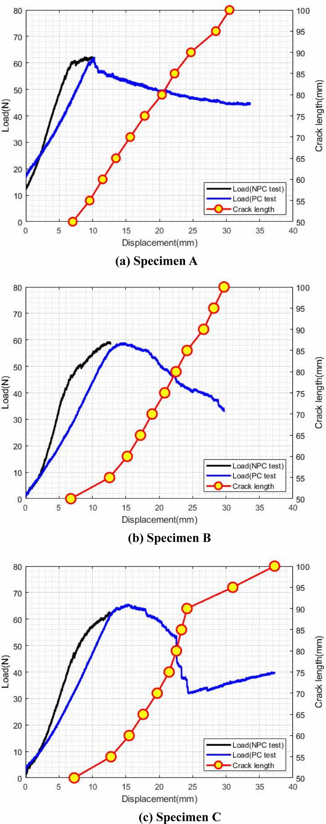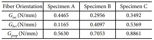 Fig. 6은 각 시편의 하중-변위 및 균열 길이-변위 곡선이다. 모든 시편의 초기 단계에서 지그의 영향으로 하중의 비선형 거동을 보였으며 본 논문에서는 비선형 거동을 보이는 데이터를 제거한 후 사용하였다. 초기 균열 개시 이후 하중이 점진적으로 감소하는 경향을 보였다. Specimen C의 경우 하중이 점진적으로 감소하다가 변위 기준 약 20 mm, 균열 길이 기준 약 75 mm 지점에서 하중이 급격하게 감소하면서 균열 성장 속도가 증가하는 경향을 보였다. DCB 시편은 폭 25 mm의 유한한 시편으로 섬유 가교 현상을 이루는 섬유가 시편의 측면에서 박리되는 현상으로 인하여 하중이 급격히 감소하였다. 또한, 변위 기준 약 25 mm, 균열 길이 기준 약 90 mm 지점에서 다시 하중이 점진적으로 증가하고 균열 진전 속도가 감소하는 경향을 보였으며, 이는 균열 면의 이동 및 새로운 섬유 가교 현상으로 인하여 기인하였다.