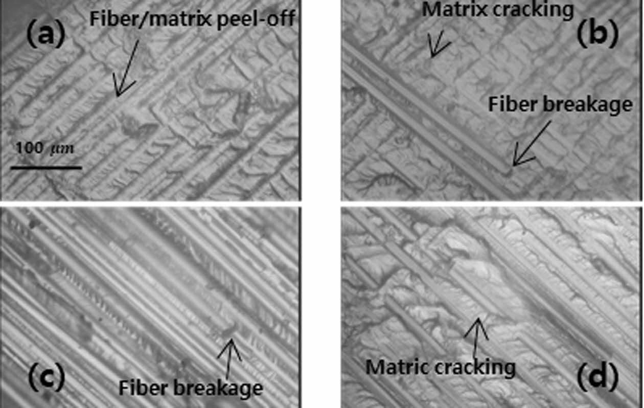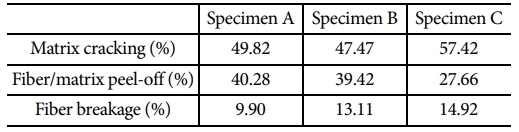 음향 방출 신호와 복합재 적층판의 파손 모드와의 관계를 분석하기 위하여 음향 방출 신호의 주파수를 사용하였다. Fig. 9는 파손 모드를 정의하여 위하여 광학현미경을 통하여 관찰한 시편의 파단면이다. Fig. 9(b)와 (d)에서 모재 균열(Matrix cracking), Fig. 9(a)에서 섬유/모재 peel-off (Fiber/matrix peel-off) 및 Fig. 9(b)와 (c)에서 섬유 파단(Fiber breakage)이 관찰되었다. 본 논문에서는 재료의 기계적 물성이 유사한 논문[18]의 결과를 인용하여 파손 모드에 따른 음향 방출 신호의 주파수 범위를 Table 6과 같이 정의하였다. 일반적으로 음향 방출 신호에서 가장 낮은 주파수 대역의 신호는 모재 균열, 가장 높은 주파수 대역은 섬유 파단을 의미하며, 중간의 주파수 대역은 모재 균열과 섬유 파단 사이에 일어나는 현상으로 규정한다. 따라서 본 논문에서는 Table 2의 Cluster 2의 신호를 섬유/모재 peel-off 신호로 정의하였다.