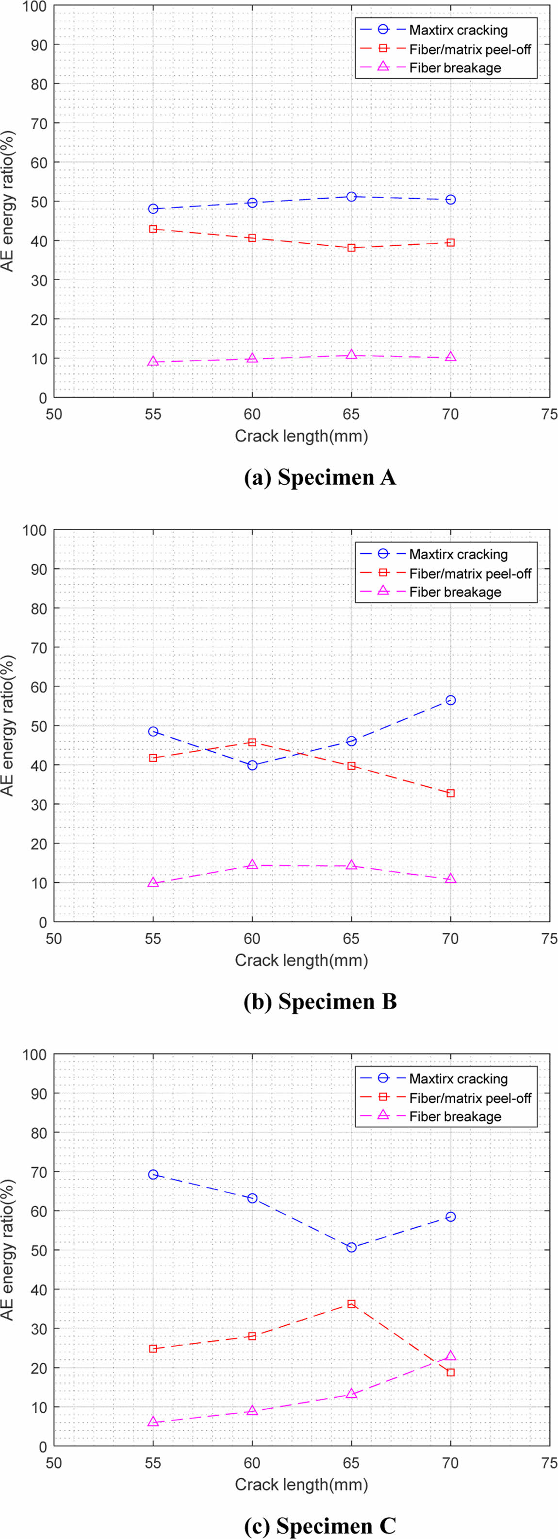 측정된 음향 방출 신호를 파손 모드에 따라 주파수 대역으로 분류하였고 power spectrum density를 이용하여 파손 모드에 따른 음향 방출 에너지를 계산하였다. 본 논문에서는 Fig. 10과 같이 균열 길이에 따른 음향 방출 에너지의 상대적 비율의 변화를 관찰하였다.
