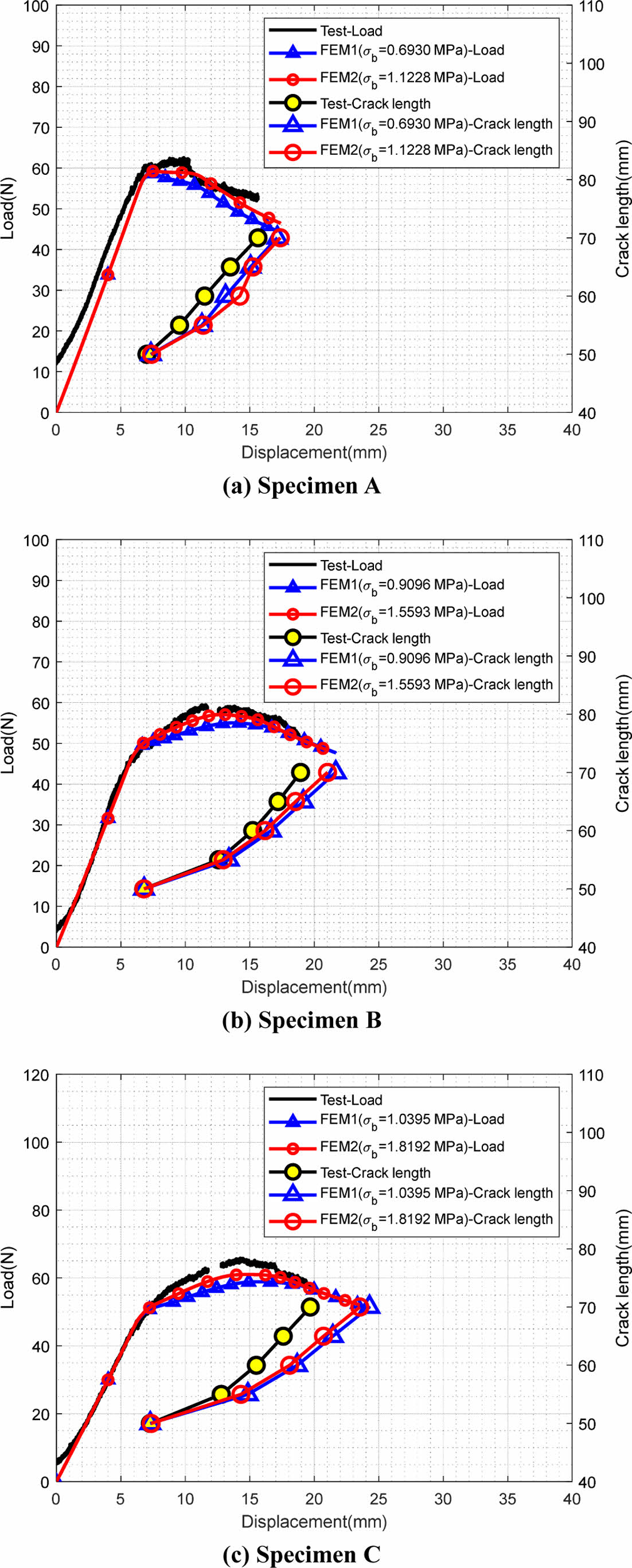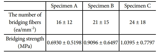 Fig. 11은 추정된 bridging strength를 적용한 유한요소해석의 결과이다. Specimen A, B 및 C의 모든 경우에서 nominal bridging strength(0.6390, 0.9096, 1.0395 MPa)보다 작은 bridging strength를 적용한 경우, 다른 경우의 비하여 시험과의 오차가 매우 큰 결과를 보여 본 논문에서 제외하였다. 시험과 유한요소해석의 하중-변위 그래프 결과 사이에 유사한 경향을 보였다. 그러나 균열 길이-변위 결과에서 시험과 유한요소해석 결과 사이에 오차를 보였으며, 계면의 섬유의 각도가 커질수록 증가하였다. 계면의 섬유 각도가 커질수록 섬유 가교 현상에 기여하는 섬유의 수가 증가하고 이러한 섬유들은 광학 장비를 통하여 측정되는 균열 길이 측정의 방해 요소로 작용할 수 있으며, 계면의 섬유 각도에 의한 균열 선단의 형상을 유한요소해석에서 정확히 모사할 수 없다는 점이 원인으로 판단된다. 하중-변위 결과를 기준으로, 모든 경우에서 nominal bridging strength보다 높은 값(즉, bridging strength가 1.1228, 1.5593 및 1.8192 MPa)을 적용한 유한요소해석 결과가 시험과 유사한 경향을 보였다. 따라서 본 논문에서 시험된 시편에서 초기에 가교된 단위 면적당 섬유의 수는 각 시편에 대하여 28, 36 및 42 ea/mm-2에 가깝다고 추정할 수 있다.