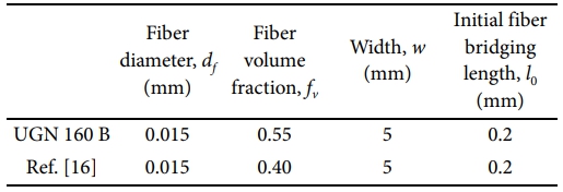 유사한 섬유가 사용된 문헌[17]의 결과를 이용하여 일방향 복합재 적층판에 대한 단위 면적당 초기 가교된 섬유 수를 추정하였다. Table 1은 UGN 160 B 및 문헌에서 사용된 복합재 적층판의 섬유 직경 및 섬유 체적 비로 섬유 체적 비(Fiber volume fraction, fv)의 차이만큼 초기 가교된 섬유 수의 차이가 발생한다고 가정하였다.