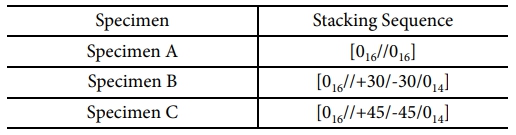 본 논문에서는 SK 케미칼(주)의 UGN 160 B 일방향 프리프레그를 사용하여 시편을 제작하였다. Table 3은 프리프레그의 물성 정보이다. 모든 시편은 Hand lay-up 후 오토클레이브를 사용하여 성형되었다. 인공결함을 구현하기 위하여 시편 중앙 면에 0.013 mm의 폴리이미드 필름을 삽입하였다. 시편의 길이, 폭 및 초기 균열 길이는 각각 260 mm, 25 mm 및 50 mm이다. 균열 면의 섬유 배열 각도를 달리하기 위하여 시편은 Table 4와 같이 3가지 적층각(0o, 30o 및 45o)으로 구성하였으며, Table 4의 “//” 인공결함이 삽입된 층을 의미한다.