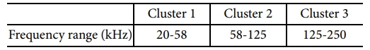 음향 방출 신호 분석은 복합재 파괴 거동 분석에 사용되어 온 가장 효과적인 도구 중 하나로 음향 방출 신호 및 복합재 적층판의 파괴 거동의 상관관계에 관한 연구가 수행되어 왔다[18-21]. Bohmann 외 저자[18]는 유리 섬유 강화 플라스틱 재료의 인장 및 DCB 시험 사이의 음향 방출 신호의 상관관계에 대해서 연구하였다. 시험을 통하여 측정된 음향 방출 신호를 k-평균 군집화 기법을 이용하여 최대 주파수를 기준으로 신호를 분류하였으며, 인장 시험 및 DCB 시험에서 발생한 음향 방출 신호 사이의 관계성에 대하여 고찰하고 분석하였다.
