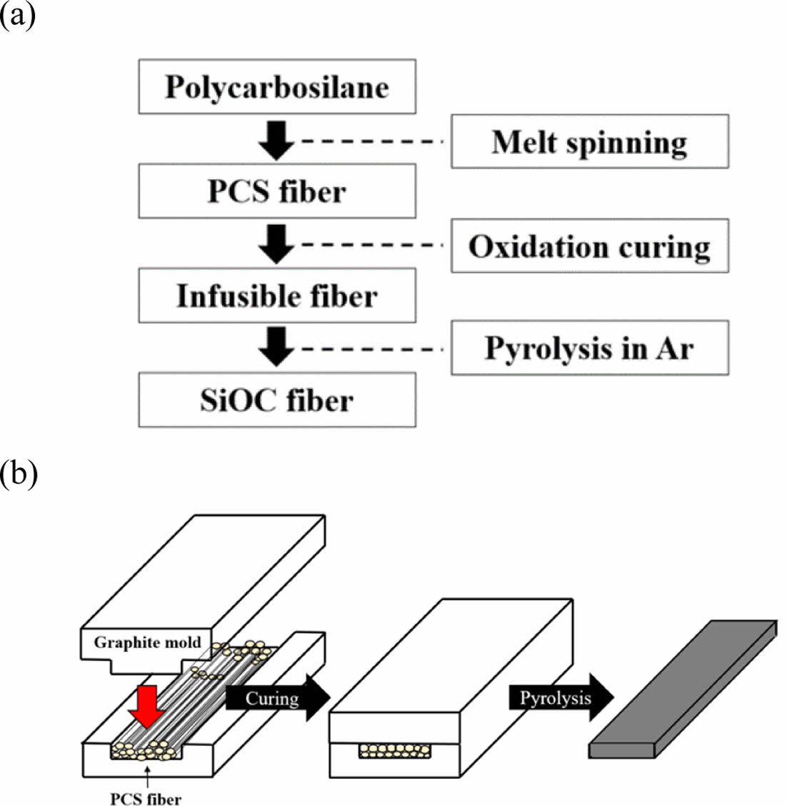 Fig. 1 shows the manufacturing process of Si-O-C fibers and the heating elements. To manufacture a stick-shaped heating element, a bundle of PCS fibers was placed inside a graphite mold (120 × 40 × 20 mm3), and the weak pressure was applied during the thermal oxidation curing process for the contact among fiber surfaces and densification of the heating element. Subsequently, pyrolysis was performed while maintaining a pressurized state.