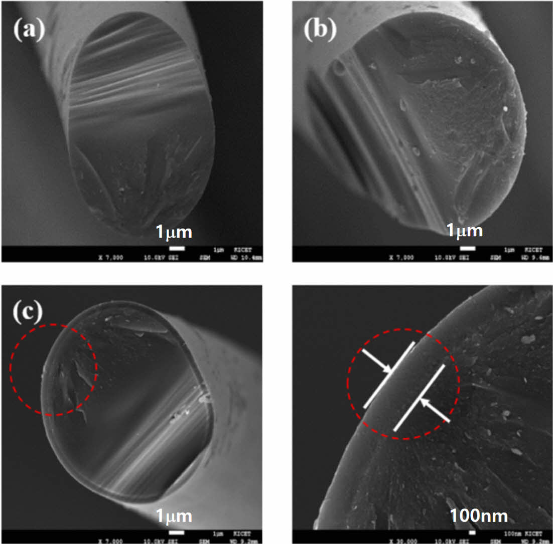 The decomposition behavior of the amorphous Si-O-C structure corresponding to the pyrolysis temperature was confirmed by the SEM analysis. As shown in Fig. 3, the fracture structure of the amorphous Si-O-C fiber pyrolyzed at 1200°C and 1300°C showed the same shape as that of the general amorphous ceramics; and mirror, mist, and hackle regions were observed on the fracture surface. A thin layer of 1 μm in size was observed on the fracture surface in the fiber pyrolyzed at 1400°C.