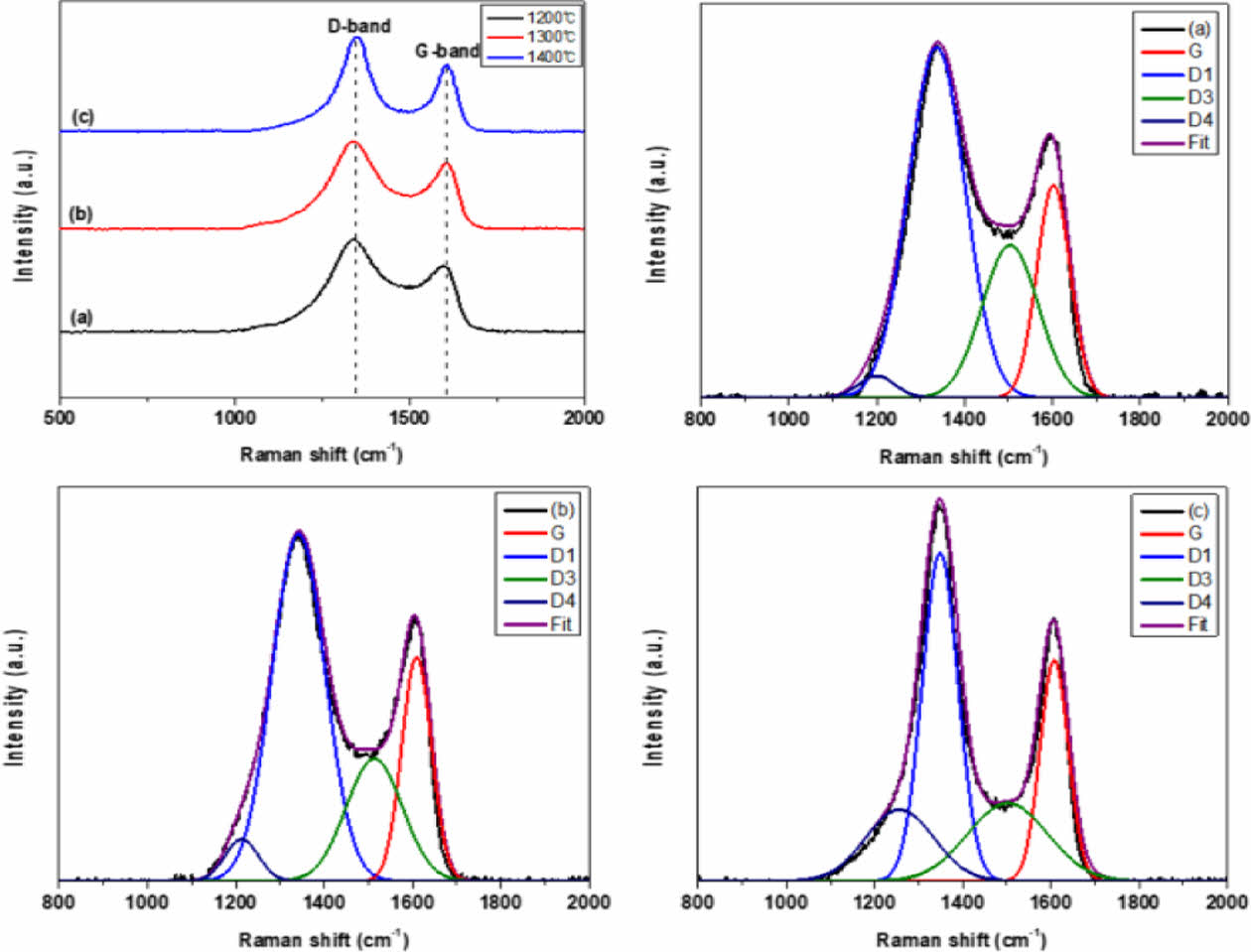 The intensity of the amorphous carbon peak (D3) decreases as the pyrolysis temperature increases [16]. The TGA analysis performed previously suggested that the amorphous carbon structure on the amorphous Si-O-C fiber surface decomposed and was released in the form of CO gas as the pyrolysis temperature increased.
