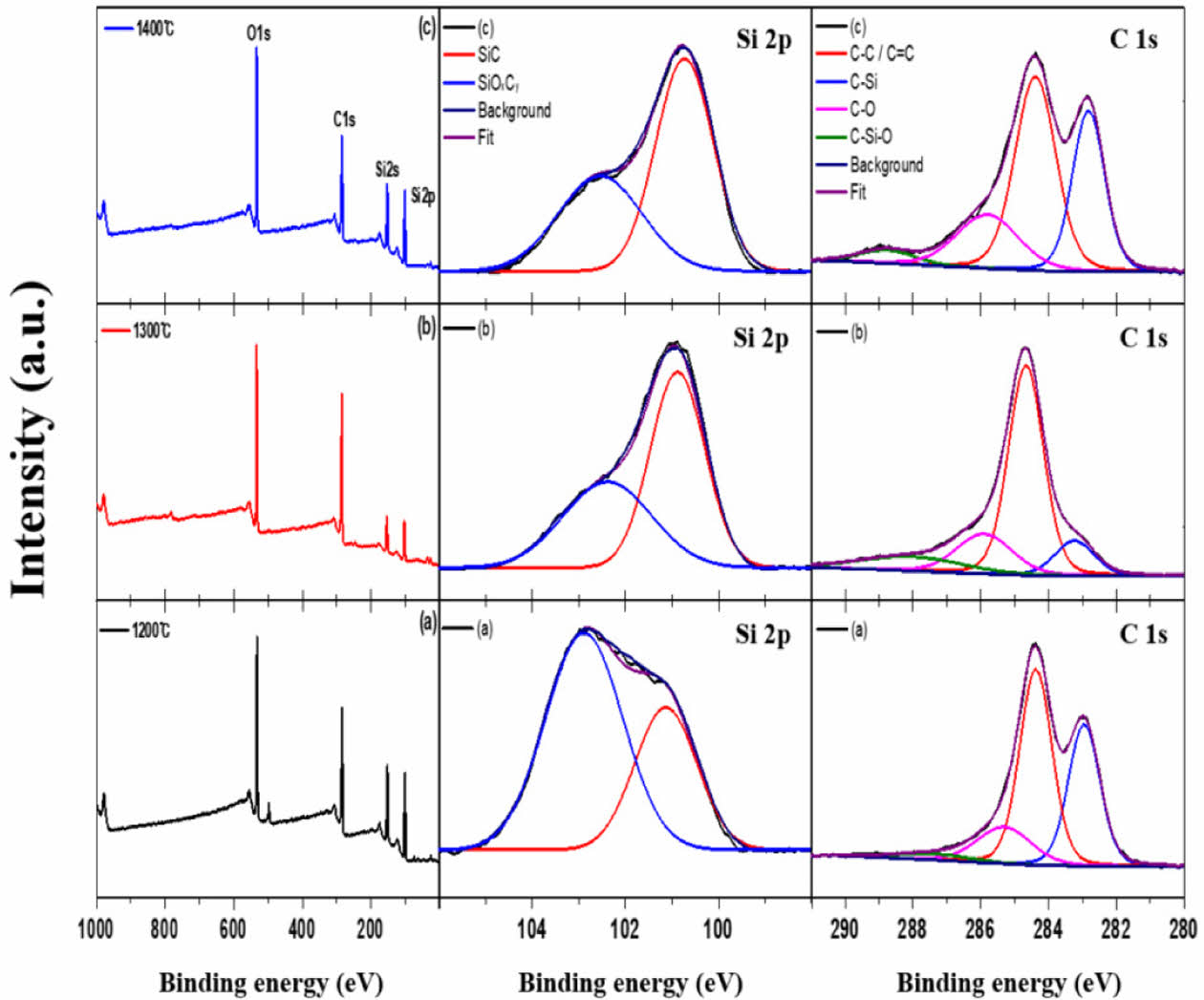 Fig. 5 shows the XPS profile corresponding to the pyrolysis temperature of the amorphous Si-O-C fibers. Si2p, Si2s, C1s and O1s peaks were formed and the Si2p and C1s peaks were separated into two and four peaks, respectively, using a Gaussian function [32]. The Si2p peak was divided into two bonding structures, Si-O-C (101.1 eV) and Si-C (102.8 eV), and the intensity of the SiC peak increased as the pyrolysis temperature increased. This is because the β-SiC crystal structure was formed during amorphous Si-O-C phase decomposition. The C1s peak was divided into four bonding structures: C–C/C = C (248.4 eV), C-Si (282.8 eV), C-Si-O (285.8 eV), and C=O (288.8 eV). The relative ratio of the graphitic carbon structure formed on the fiber surface was determined by calculating the area ratio occupied by the C–C/C = C (248.4 eV) bonding structure. The area ratios were 70.3, 75.5%, and 71.1% at pyrolysis temperatures of 1200°C, 1300°C, and 1400°C, respectively. First, the C–C/C =C (248.4 eV) bonding structure area ratio increased because of the excess carbon formed during phase decomposition of the amorphous Si-O-C on the surface at 1200–1300°C. The chemical combination of the SiO gas and excess carbon, as shown in Equation (2), leads to a decrease in the area ratio [33].