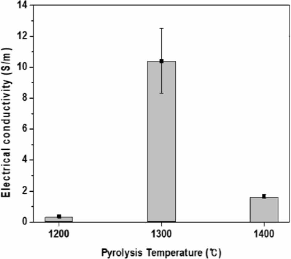 Fig. 6 shows the electrical conductivity values of amorphous Si-O-C fibers measured using the two-point probe method. This fiber is composed of a conductor with a carbon structure, nano-sized SiC semiconductor structure, amorphous Si-O-C structure, and nanopores of an insulator. The fiber’s conductivity at the pyrolysis temperature of 1200°C was measured to be an average of 0.37 ± 0.06 S/m. This is a result of poor electrical properties of the amorphous Si-O-C and carbon phases, which mainly form on the fiber surface. The fiber prepared at a pyrolysis temperature of 1300°C was measured to have an average conductivity of 10.41 ± 2.09 S/m. A graphitic carbon structure formed during the phase decomposition of the amorphous Si-O-C phase on the fiber surface, and a stable surface layer was maintained without weight reduction. In the case of the 1400°C pyrolyzed fiber, the electrical conductivity decreased to an average of 1.66 ± 0.12 S/m. The volume fractions of free carbon and SiC structure have a significant influence on the amorphous Si-O-C fiber conductivity. The volume fraction of free carbon in the amorphous Si-O-C fiber decreases owing to endogenous oxidation during the amorphous Si-O-C phase decomposition at 1400°C or higher, so the conductivity is related only to the SiC structure resistivity.