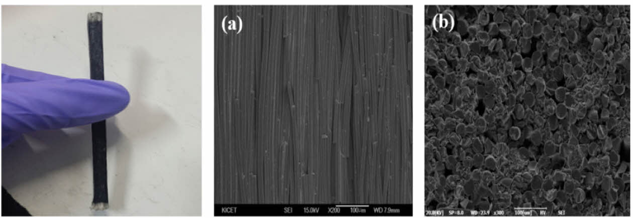 Fig. 7 shows SEM images of the stick-type amorphous Si-O-C fiber heating element. Although it had a relatively good fiber shape, an empty space was formed between the fibers. This is because a simple pressurization method was used to maintain the shape of the heating element during oxidation curing. The heat test results for the stick-type amorphous Si-O-C fiber heating element are shown in Fig. 8. The measurement started at 200°C, which is the lowest temperature value of the infrared camera. The test voltage was constantly maintained at 340 V. The heating element manufactured at a pyrolysis temperature of 1200°C did not generate heat because of the low electrical conductivity. The heating element at 1300oC took 80 seconds to reach the maximum measurement temperature range of 1200oC and consumed 276.95 W of power.