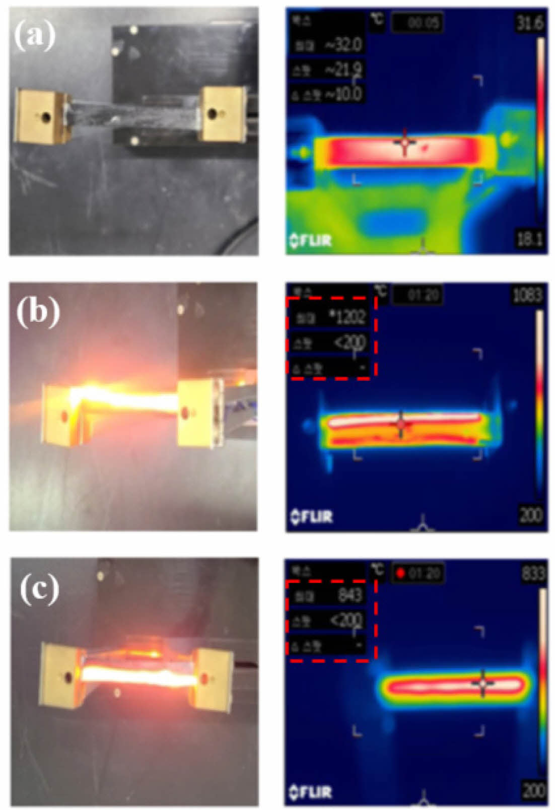 The difference in the electrical conductivity of the fibers manufactured at 1200°C and 1400°C was approximately 1S/m, but heat was generated in the case of the heating element manufactured at 1400°C. It reached 843oC within 80 seconds, and 188.74 W of power was consumed. In both the heating elements, less graphitic carbon was formed on the surface compared to the heating element manufactured at 1300°C. The heating element manufactured at 1400°C generated heat because of its structural resistivity of SiC and reduced graphitic carbon structure, unlike the one produced at 1200°C which had amorphous structural resistivity.