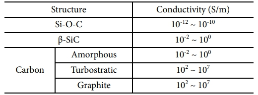 SiC fibers are prepared by melt spinning of polycarbosilane (PCS) as a precursor material. In the 1970s, Yajima reported the synthesis of PCS under a high-temperature and high-pressure reaction of polydimethylsilane (PDMS) [10-13]. Melt spinning, oxidation curing, and pyrolysis processes were sequentially performed to make silicon oxycarbide (Si-O-C) fibers [14,15]. Silicon oxycarbide fibers are composed of amorphous Si-O-C matrix, nanocrystalline silicon carbide (β-SiC), and a residual turbostratic carbon phase. It has various structural and mechanical characteristics depending on the conditions of the manufacturing process [16-19]. In particular, studies have been conducted that are related to the evaluation of electrical properties based on microstructural changes that occur during pyrolysis. Electrical conductivities of SiC fiber derived from polycarbosilane has 0.3~120 (Wm)-1 at room temperature and increased with heating temperature depends on their microstructural composition such as degree of crystallization, amount of amorphous matrix, and residual carbon. They depend on the fiber curing and heat-treatment conditions and are major factors related to the electrical properties of the fiber [20-23]. The electrical conductivity of each structure constituting the fibers is listed in Table 1.