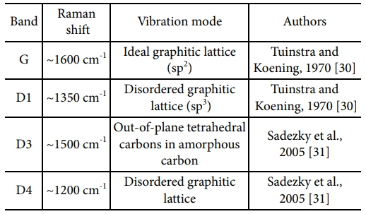 The carbon structure on the surface of the amorphous Si-O-C fiber was separated into an excess carbon layer, carbon nano-crystals dispersed on the amorphous Si-O-C, and amorphous structures using gaussian functions (Table 2). The G, D1, D3, and D4 peaks appeared at 1607 cm-1, 1347 cm-1, 1506 cm-1 and 1205 cm-1, respectively (Fig. 4).