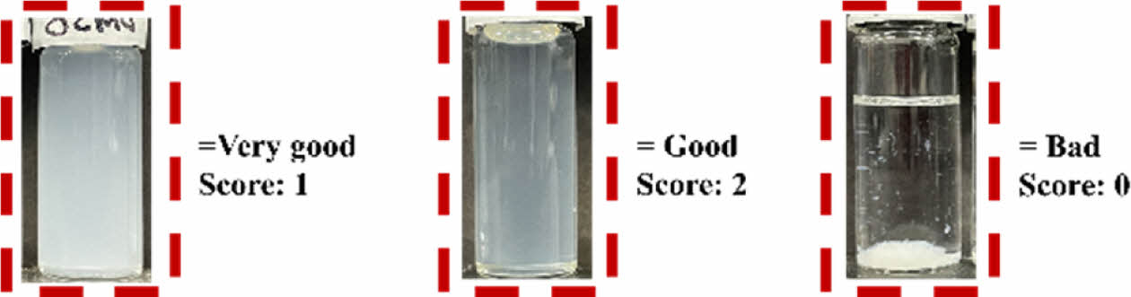 시간별로 tip 초음파 처리한 BNNT 특성 분석 결과를 기반으로 하여 tip 초음파 시간을 2분으로 조건을 선정해, acetone, benzyl alcohol, methanol, 2-propanol, chloroform, methylene dichloride (dichloromethane), ethyl acetate, toluene, ethanol, water, tetrahydrofuran (THF), n,n-dimethyl acetamide (DMA), dimethyl formamide (DMF), n-methyl-2-pyrrolidone (NMP), dimethyl sulfoxide (DMSO)의 총 15가지의 용매에 0.1 mg/ml의 농도로 분산시키고 한센 용해도 매개변수를 이용하여 분산성을 평가하였다. 용매의 매개변수 값은 Hansen solvent list를 참조하였으며, 소프트웨어는 HSPiP 5th Edition 5.4.05버전을 활용하였으며, genetic algorithm, inside를 1로 설정하여, 1점으로 평가한 용매가 구 내부에 위치할 수 있도록 fitting 하였다. 분산 샘플은 0, 7일차에 육안 관찰을 진행하였다. 7일 경과 후, 육안으로 평가한 분산 상태에 따라서 점수를 부여하였다(Fig. 1). 분산되지 않은 상태는 0점, 적당히 분산은 되어 있으나 가라앉은 상태는 2점, 완벽히 분산된 상태는 1점으로 평가하였다.