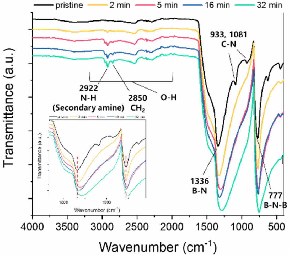 Tip 초음파 시간별로 분산한 BNNT 샘플을 회수하여 FT-IR spectroscopy를 분석하였다(Fig. 2). Pristine BNNT에서 777, 1336, 2922 cm-1에서 B-N-B, B-N, N-H 진동모드 및 933, 1081 cm-1에서 C-N 진동모드가 나타났다. Tip 초음파 처리한 샘플에서는 2850 cm-1에서 CH2가 새로 나타났는데, tip 초음파 처리 중 기존의 C-N 결합이 깨지고 C-H 결합이 형성된 것으로 판단된다. 또한, tip 초음파를 5, 16, 32분 처리한 샘플에서는 B-N 및 B-N-B 결합이 757, 1288 cm-1로 shift가 일어났다. CH2 형성 및 B-N, B-N-B 피크의 shift를 통해 tip 초음파 처리로 인한 영향이 있음을 확인하였다.