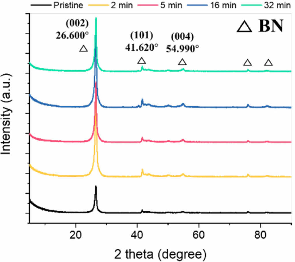 Fig. 4의 XRD 분석을 통해 tip 초음파 처리 시간 0, 2, 5, 16, 32분 별로 BNNT의 결정성 변화를 확인하였다. 2θ = 26.600, 41.620, 54.990°에서 (002), (101), (004)의 BN 결정면 피크가 나타났으며, Tip 초음파 처리 전후 BNNT의 (002) 결정면 피크의 d-spacing 값은 3.347 Å로, 결정면의 변화는 없음을 확인하였다.