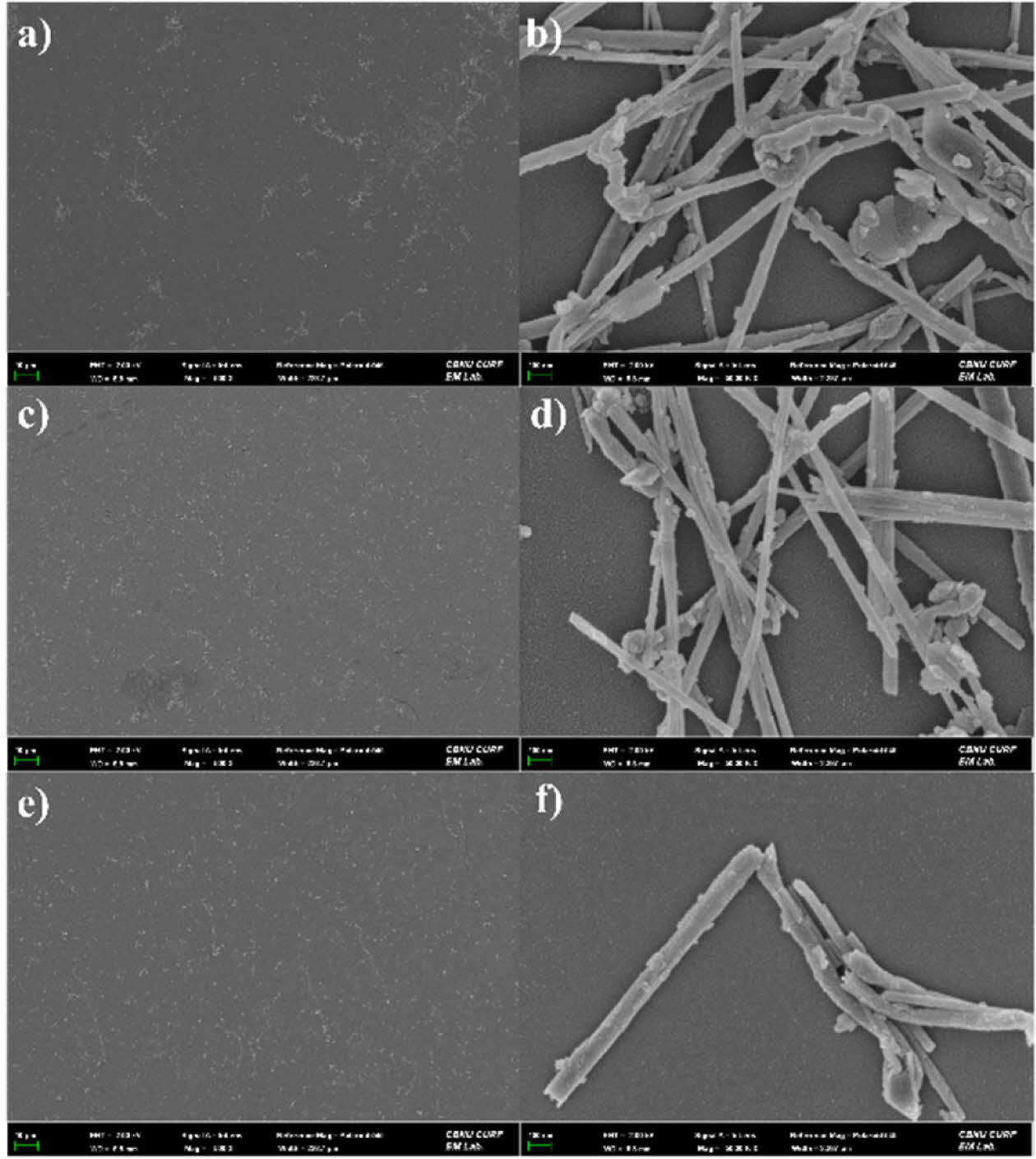 Fig. 5 FE-SEM images of dispersed BNNT under different tip sonication conditions: (a, b) pristine, (c, d) 2 min, (e, f) 32 min |