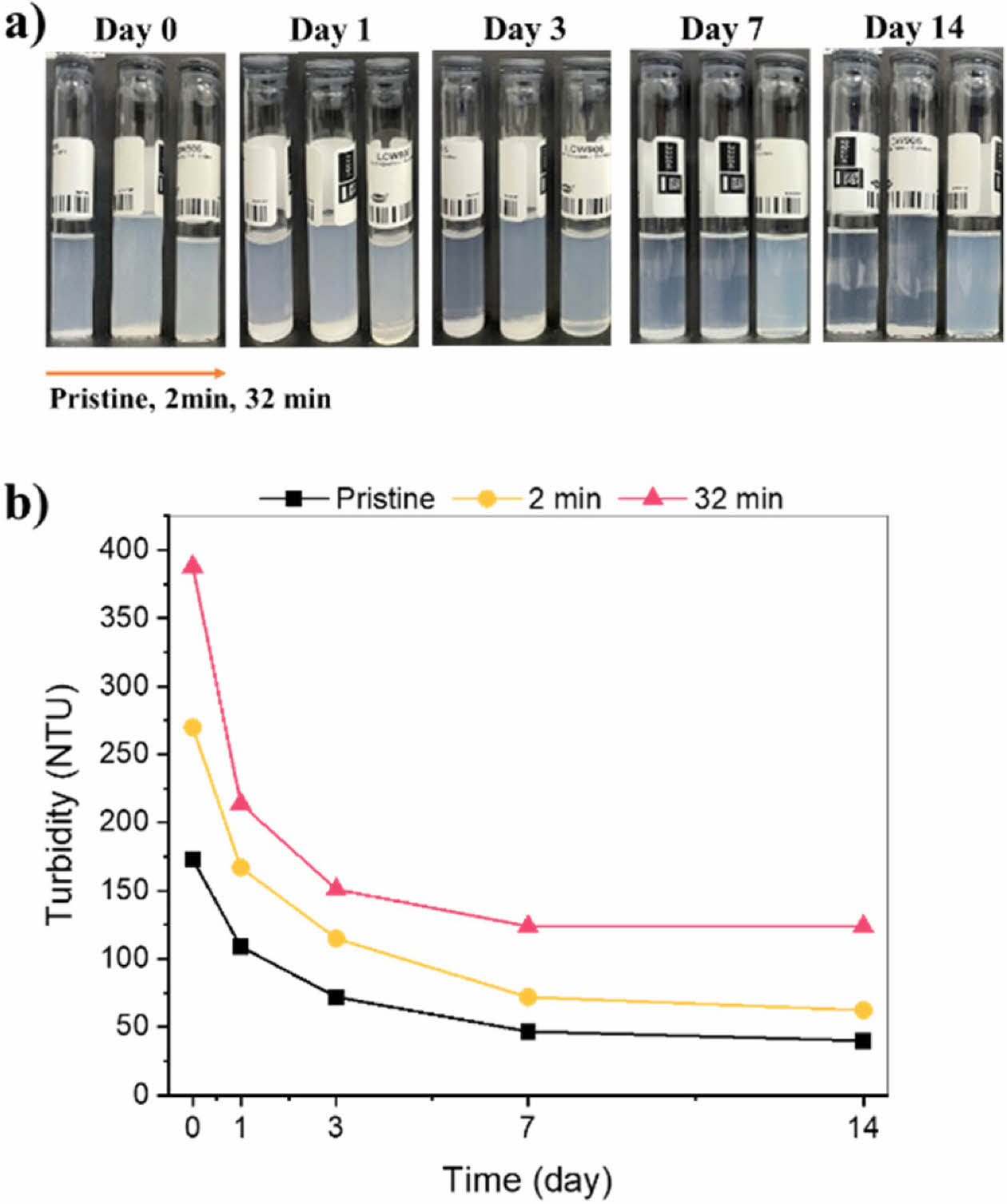 농도 0.1 mg/ml로 물에 분산한 BNNT의 육안 및 탁도 분석하였다(Fig. 6). 0일차에 pristine과 2분 tip 초음파 처리한 샘플은 응집된 BNNT들이 가라 앉았으나, 상층액이 불투명함을 확인하였다. 그러나, pristine BNNT는 3일차부터 상층액이 투명하며, 2분 처리한 샘플은 7일차부터 상층액이 투명하였다. 32분 처리한 샘플은 14일차까지도 가라앉은 BNNT들이 없었으며 안정적으로 분산된 것을 확인하였다.