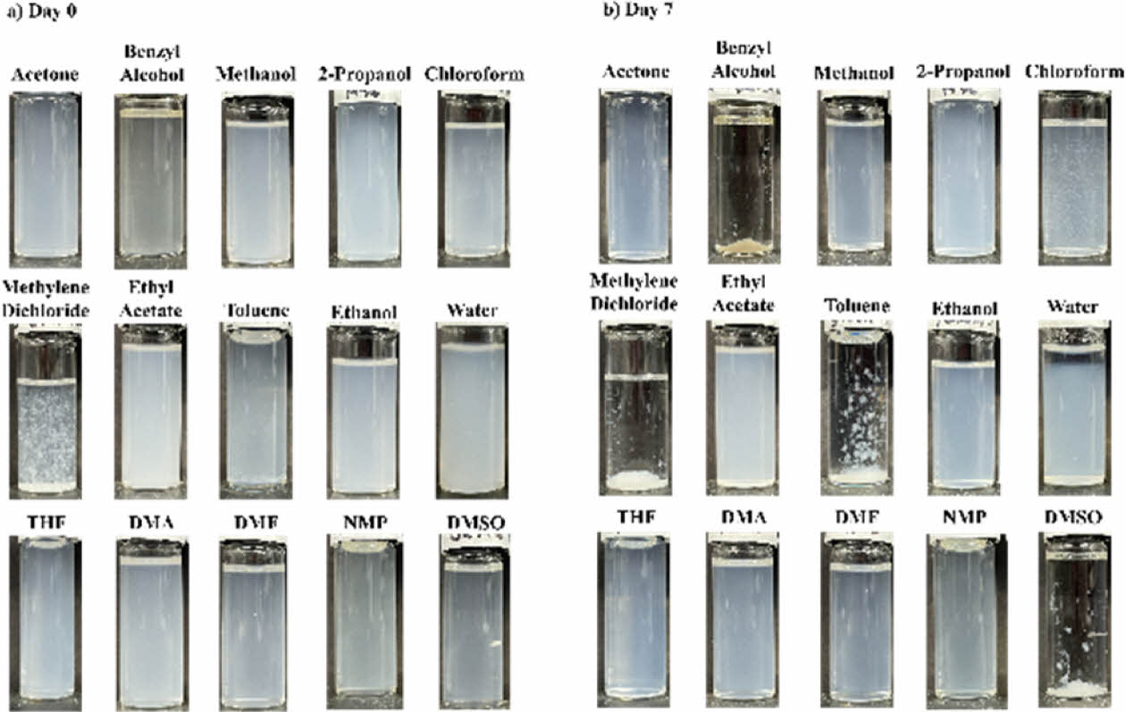 이후, 15가지의 용매에 tip 초음파 처리 2분 처리 조건으로 BNNT를 분산시키고, 0, 7일차 육안관찰을 시도하였다. 7일차 육안관찰 결과를 기반으로 점수를 매기고, Hansen solubility parameter를 통하여 용해도 범위를 평가한 결과, δD, δP, δH는 각각 14.7, 7.3, 13.7 MPa0.5를 나타냈으며, tip 초음파 처리로 인한 분산 개선 및 BNNT 제품 자체의 불순물인 NH 등으로 인하여 이러한 결과가 나온 것으로 판단된다.