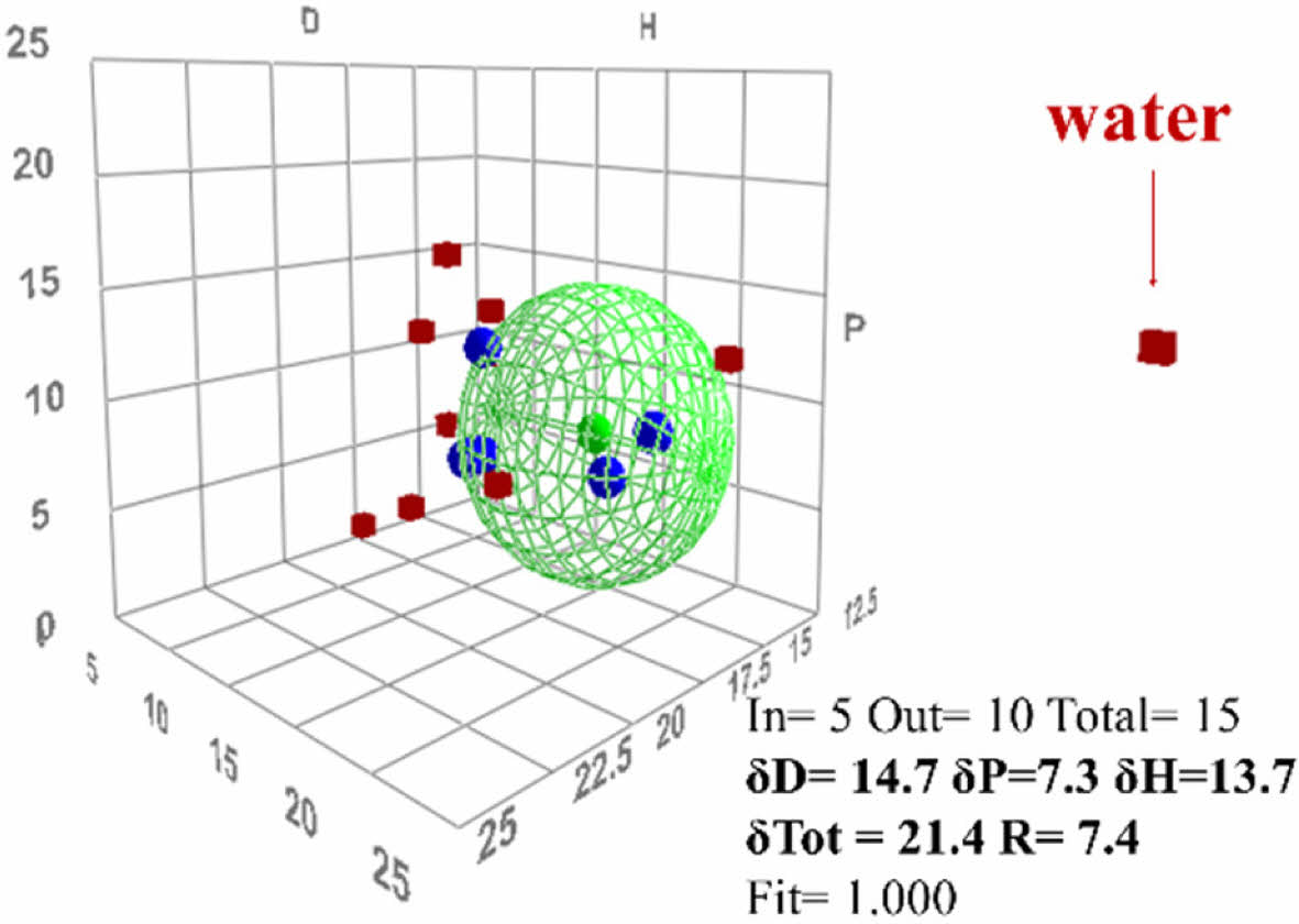 매개변수를 이용하여 δD, δP, δH를 각각 x축, y축, z축으로 하는 3차원 공간인 HSP space에서 한 물질이 다른 물질에 용해되어 용액을 형성하는지 예측하고, 용해도 범위를 추정한 구를 형성하였다. 한 물질의 HSP는 δD, δP, δH를 원점으로 하고, δT를 반지름으로 하는 구를 형성하며, 용질과 용매 사이의 거리 Ra는 다음 식 (4)과 같이 구할 수 있다.