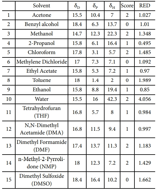 δD2, δP2, δH2는 용매의 매개변수, δD1, δP1, δH1는 용질의 매개변수를 의미한다. 구 내부에는 용매와 용질의 매개변수가 존재하며, 용매의 매개변수가 용질의 매개변수인 구의 중심에 가까울수록 용해될 가능성은 증가한다. 또한, 상대적인 에너지 차이(relative energy difference, RED)를 이용하여 HSP space에서 혼합물의 위치를 확인할 수 있으며, RED는 식 (5)와 같이 Ra를 용질의 구 반지름이자 상호작용 반경인 R0로 나누어 구할 수 있다.