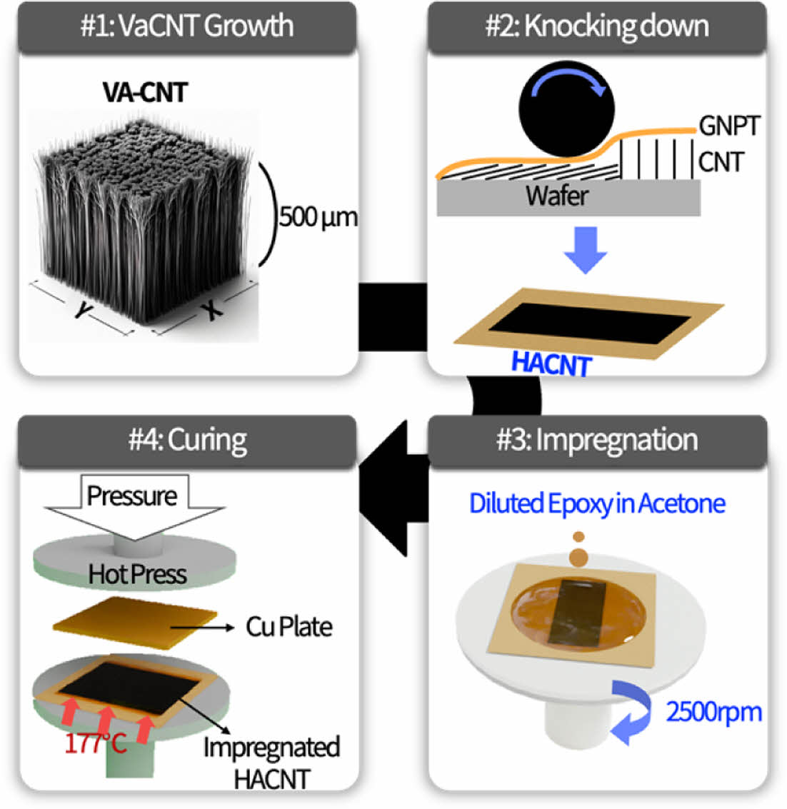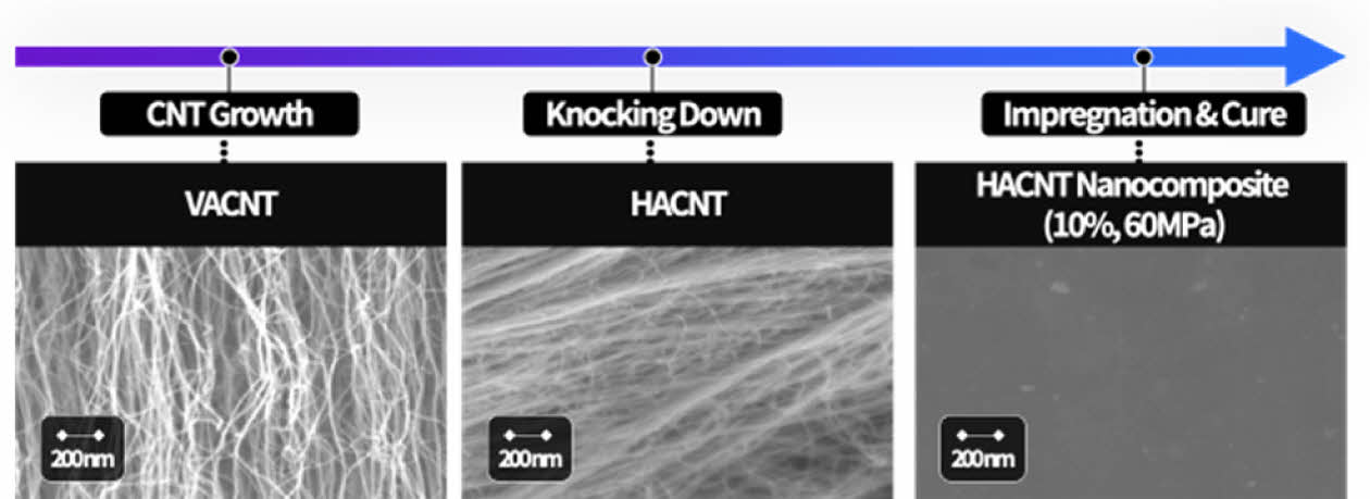 높은 CNT 부피분율을 가지는 나노복합재를 제작하기 위해 Knocking Down 공정을 이용하였다. 이는 롤러를 사용하여 성장된 VACNT 배열(Array)를 수평으로 정렬시키는 공정을 의미한다. 이 공정에서 Knocking Down은 GNPT (PC-6, Precision Coating, USA) film에서 수행되었으며, 높은 CNT 부피분율을 갖기 위해 2층의 VACNT 배열이 GNPT film으로 전사되어, 수평 정렬된 HACNT로 제작하였다.
