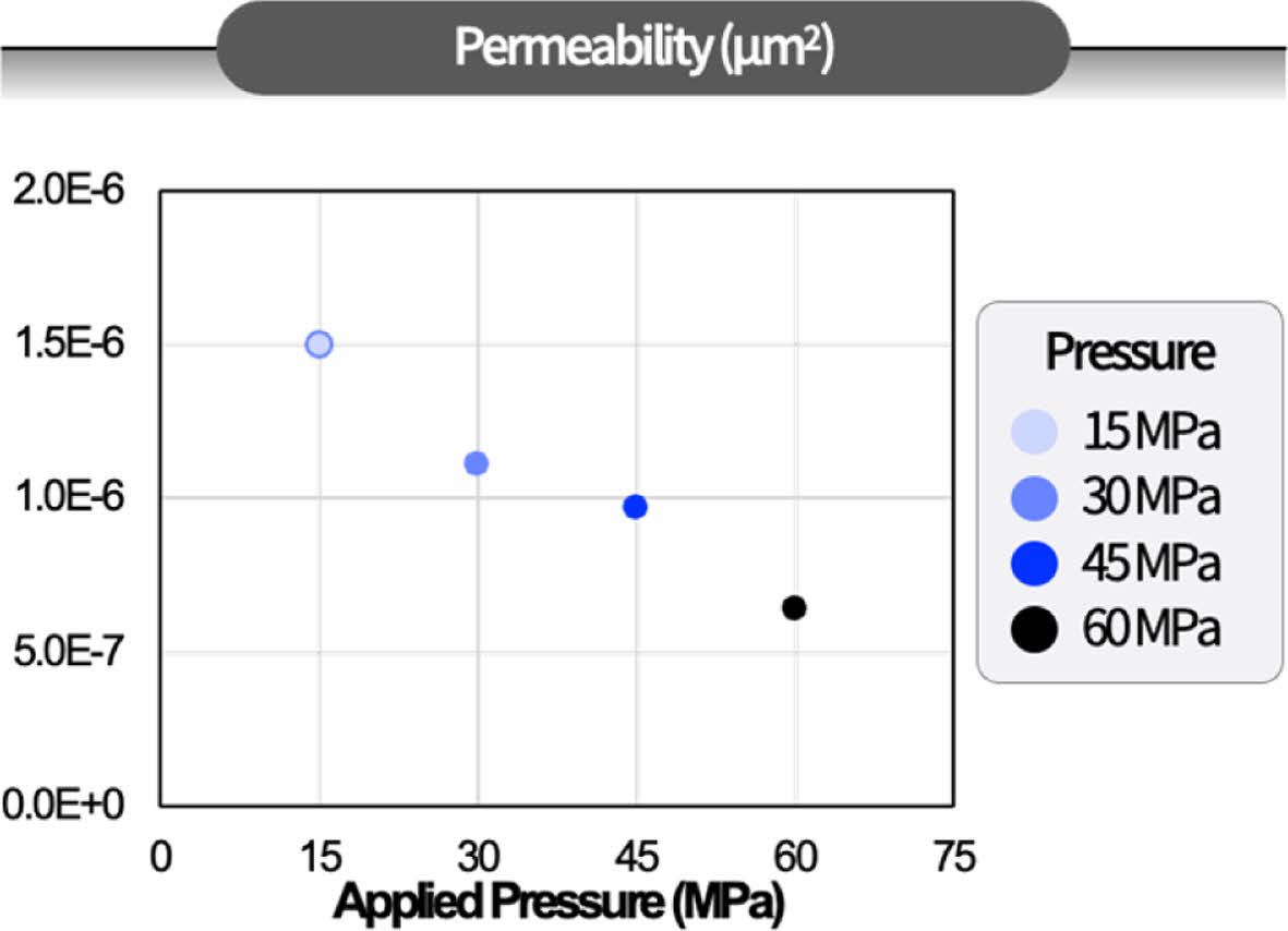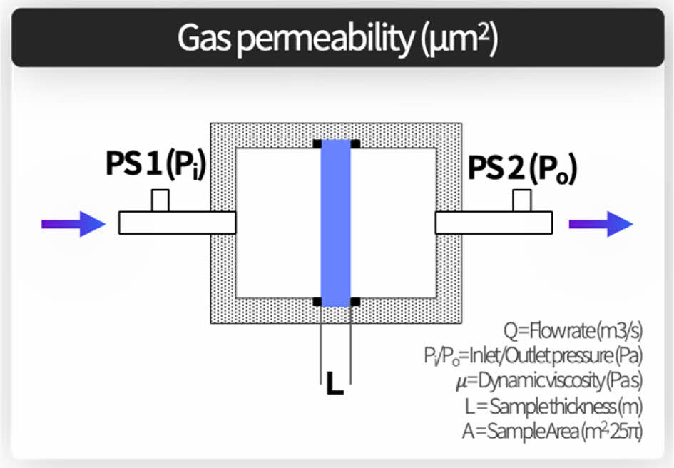 여기서 k는 가스 투과도(μm²), Q는 기체 유량(m³/s), μ는 기체의 동점도(Pa∙s), L는 시료의 두께(m), A는 시료의 단면적 (m²), 그리고 Pi와 Po는 각각 입구 및 출구의 압력(Pa)을 나타낸다.