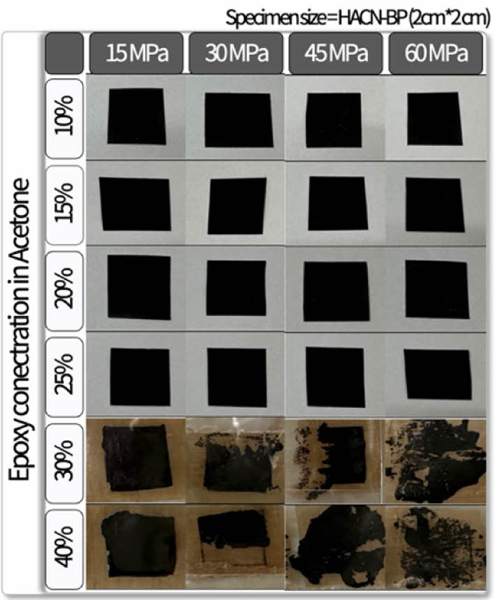 Fig. 4와 같이 HACNT 나노복합재 제조 시 에폭시와 아세톤의 희석비율과 프레스 압력에 따른 복합재의 형상을 관찰하였다. 아세톤에 대한 에폭시 희석비율(Epoxy concentration in Acetone)을 10%에서 40%로 조절하고, 각 희석비율에 대해 15 MPa에서 60 MPa의 프레스 압력을 가하여 복합재를 제조하였다.